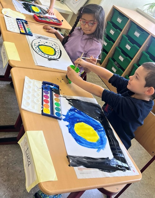 Die Klasse 1b lauschte in der letzten Woche der Geschichte von Fritzi, einer kleinen Fledermaus. Nachdem Fritzi vergeblich versuchte mit seinen Geschwistern um Mitternacht zu spuken, beschloss er von nun an die freundlichste Fledermaus aller Zeiten zu werden und dekorierte passend dazu das ungruseligste Haus der Stadt. Passend dazu gestalteten die Kinder mit Wasserfarben und im Anschluss mit Tonpapier die Fledermaus Fritzi oder dessen Haus und hatten dabei viel Freude!