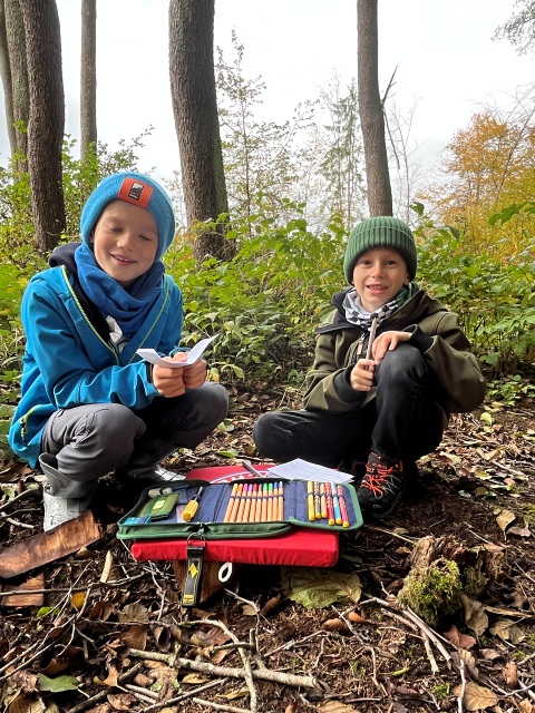 Wir sammelten Waldschätze wie bunte Blätter, Zapfen, Moos, Schneckenhäuser und Eicheln und füllten damit unsere Schatzkisten. Die Klassen bauten kleine Tipis aus Stöcken, wir beobachteten Tiere und Pflanzen. Besonders spannend waren die Nasenzwicker – die Früchte des Ahorns, die man sich an die Nase stecken kann.