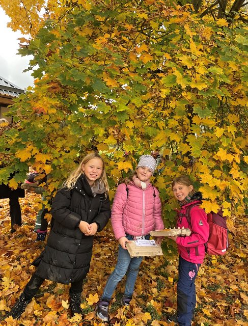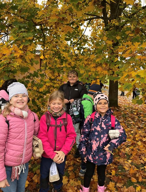 Wir sammelten Waldschätze wie bunte Blätter, Zapfen, Moos, Schneckenhäuser und Eicheln und füllten damit unsere Schatzkisten. Die Klassen bauten kleine Tipis aus Stöcken, wir beobachteten Tiere und Pflanzen. Besonders spannend waren die Nasenzwicker – die Früchte des Ahorns, die man sich an die Nase stecken kann.