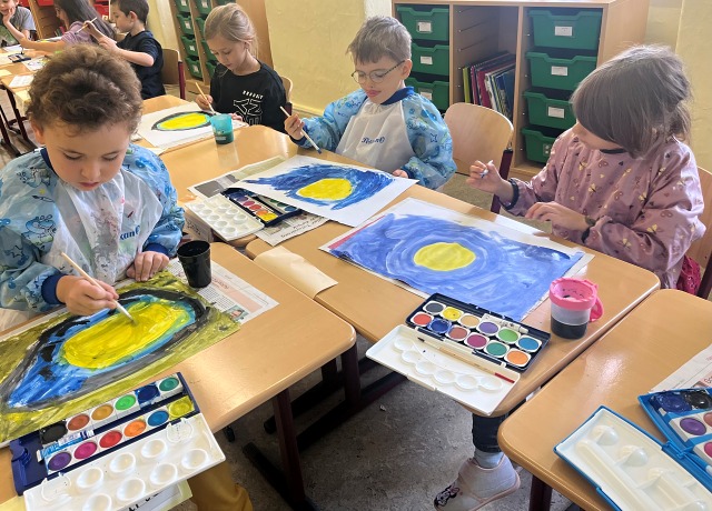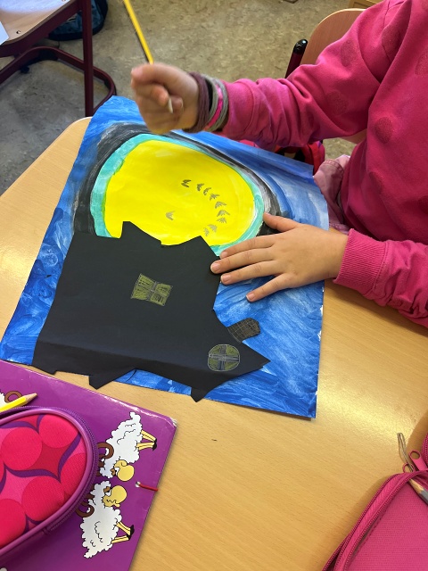 Die Klasse 1b lauschte in der letzten Woche der Geschichte von Fritzi, einer kleinen Fledermaus. Nachdem Fritzi vergeblich versuchte mit seinen Geschwistern um Mitternacht zu spuken, beschloss er von nun an die freundlichste Fledermaus aller Zeiten zu werden und dekorierte passend dazu das ungruseligste Haus der Stadt. Passend dazu gestalteten die Kinder mit Wasserfarben und im Anschluss mit Tonpapier die Fledermaus Fritzi oder dessen Haus und hatten dabei viel Freude!